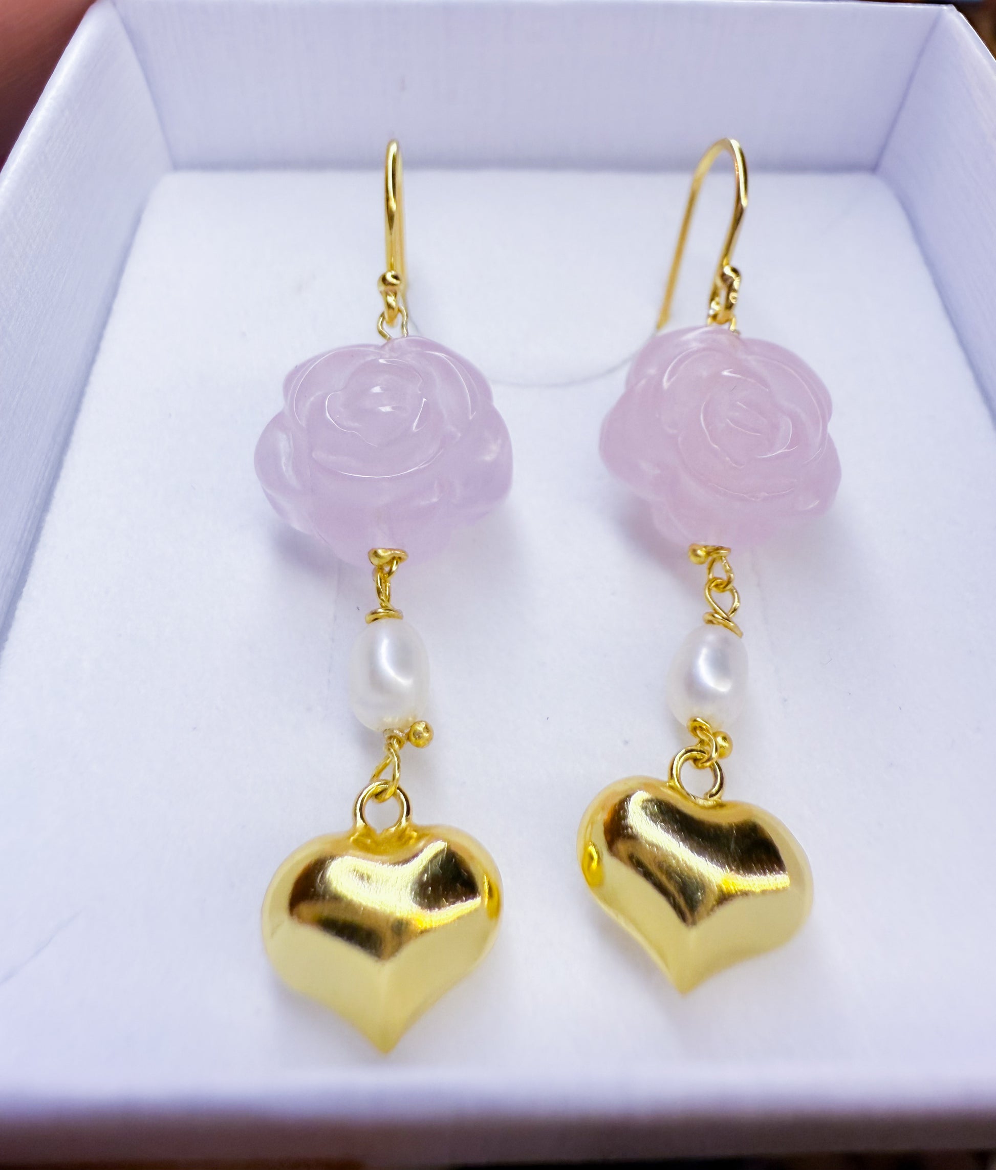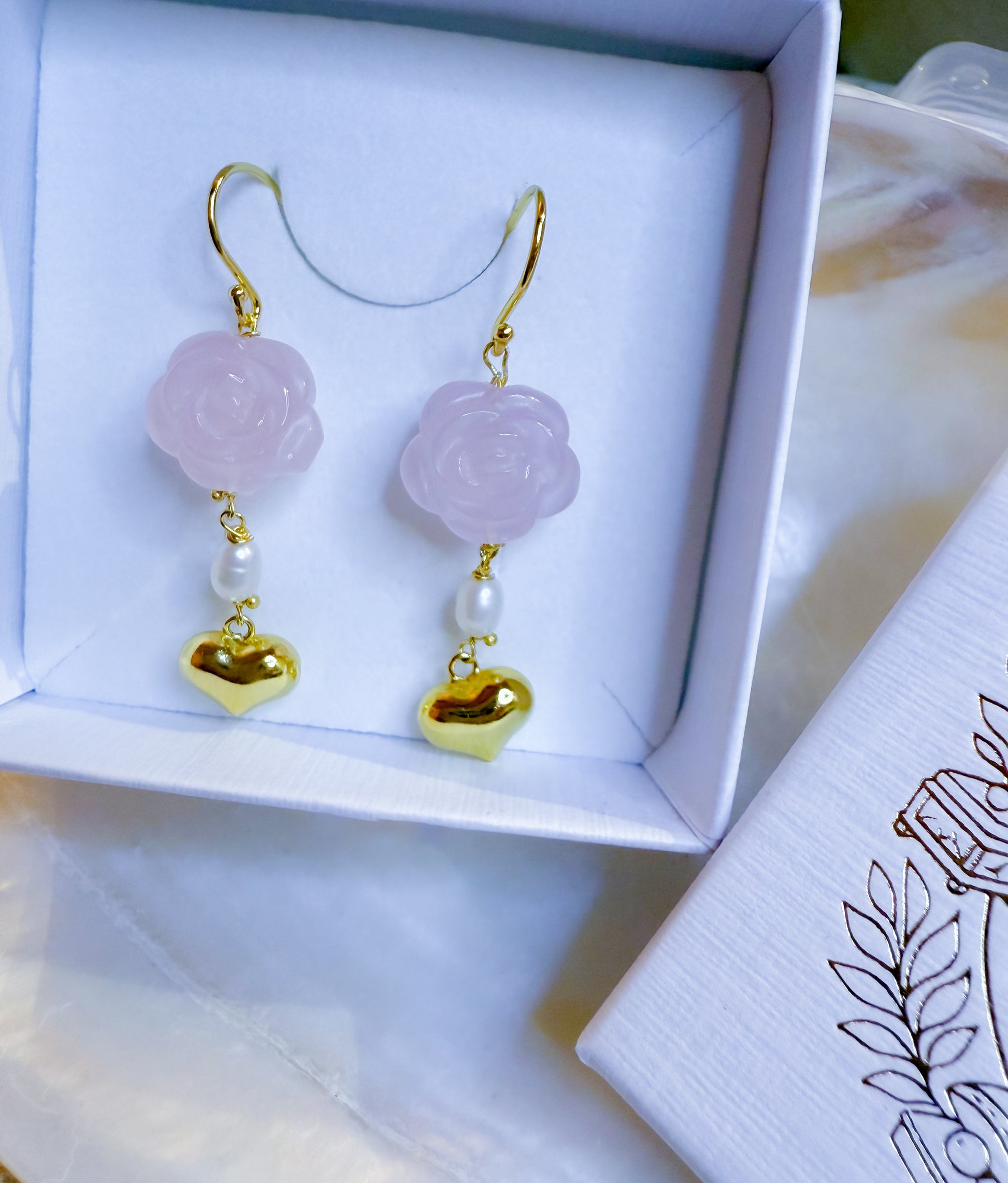 A delicate blend of romance and elegance, Rosée d’Amour captures the softness of love in every detail. Each earring features a hand-carved rose in natural rose quartz, symbolizing tenderness and calm. Beneath it hangs a lustrous natural pearl, adding a touch of timeless grace, and a golden heart charm that completes the design with a warm, luxurious glow.