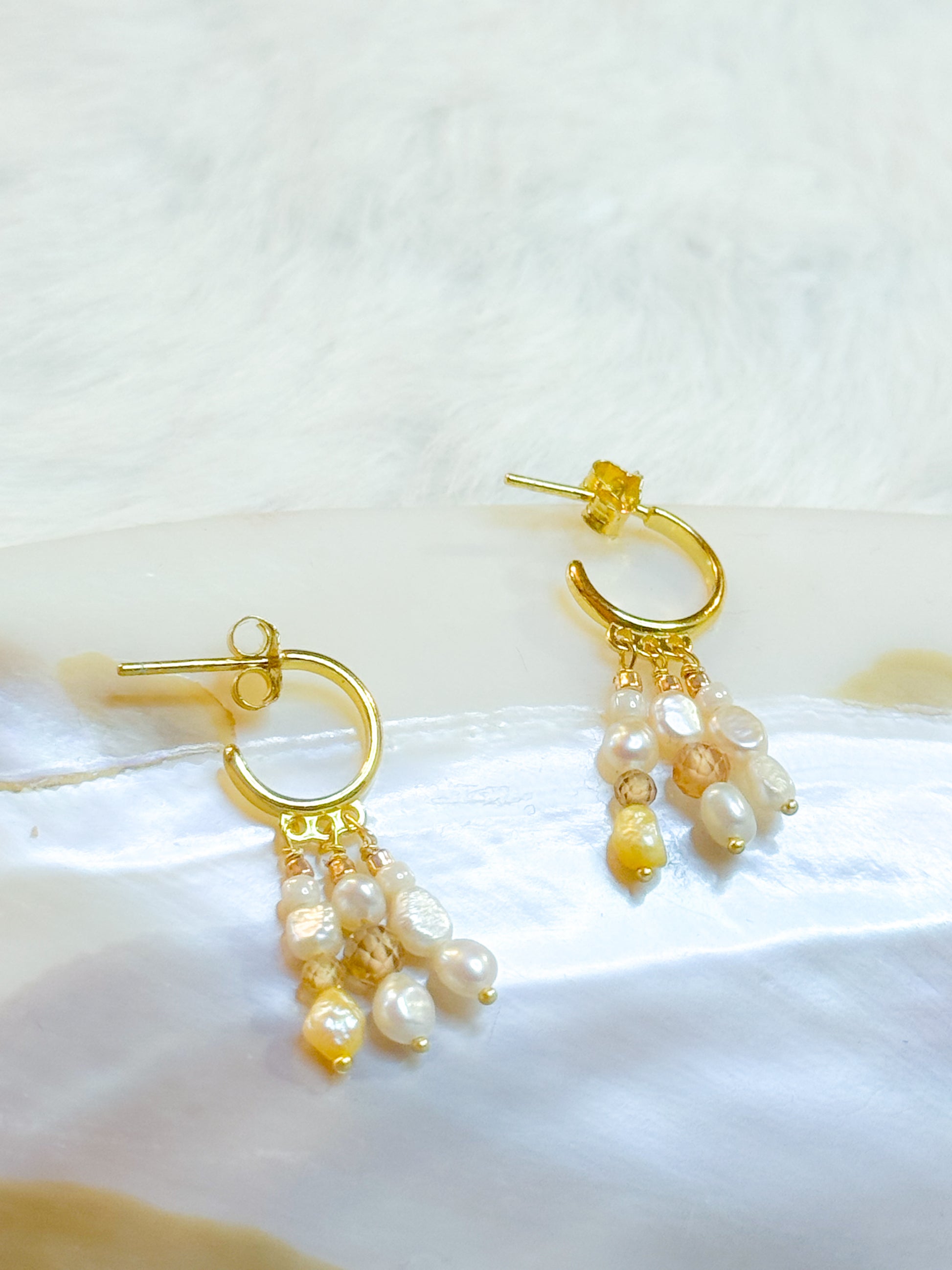 Hand-assembled with natural freshwater pearls, warm honey-amber tones, and tiny gold accents, Mia brings gentle movement and glow to every look.